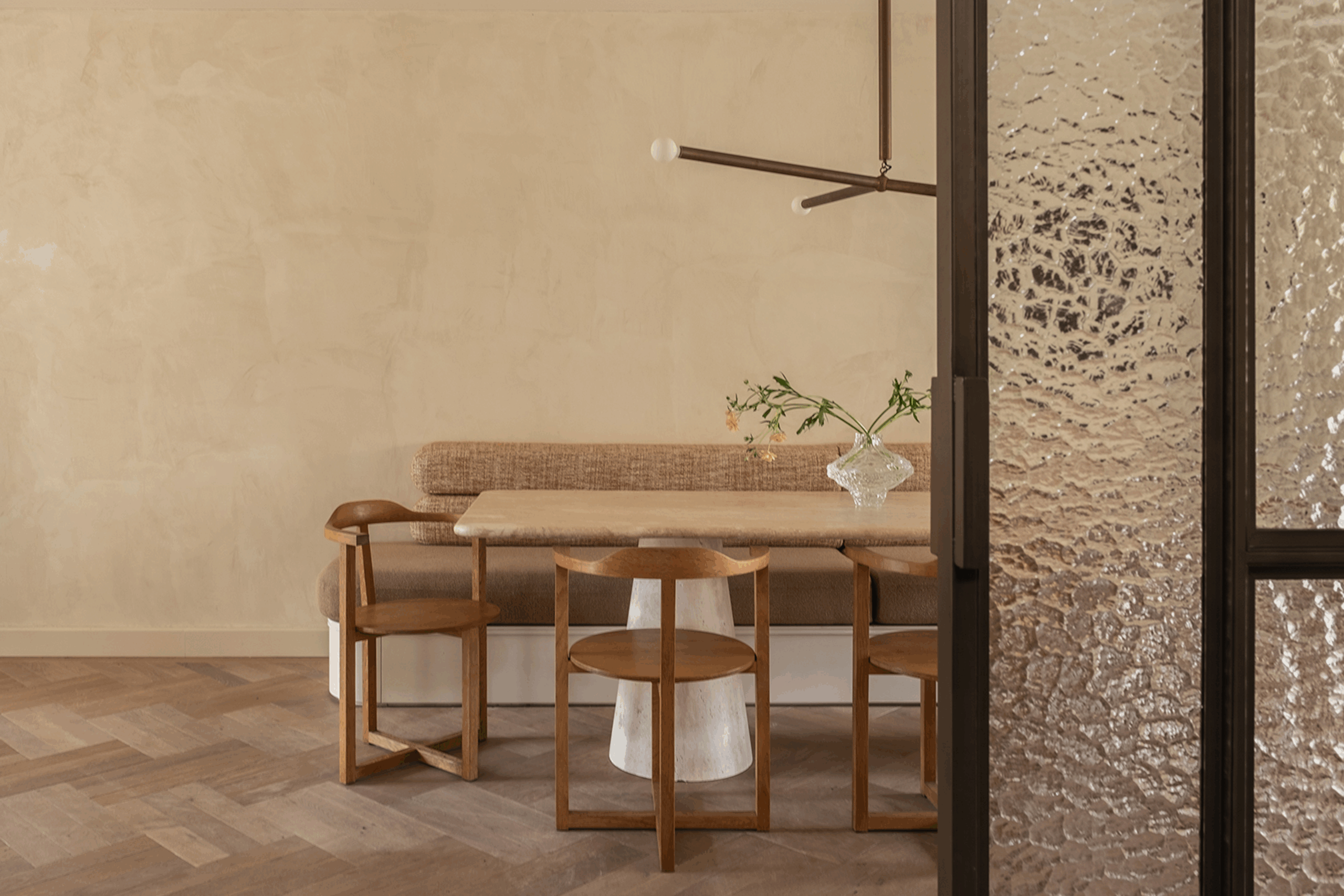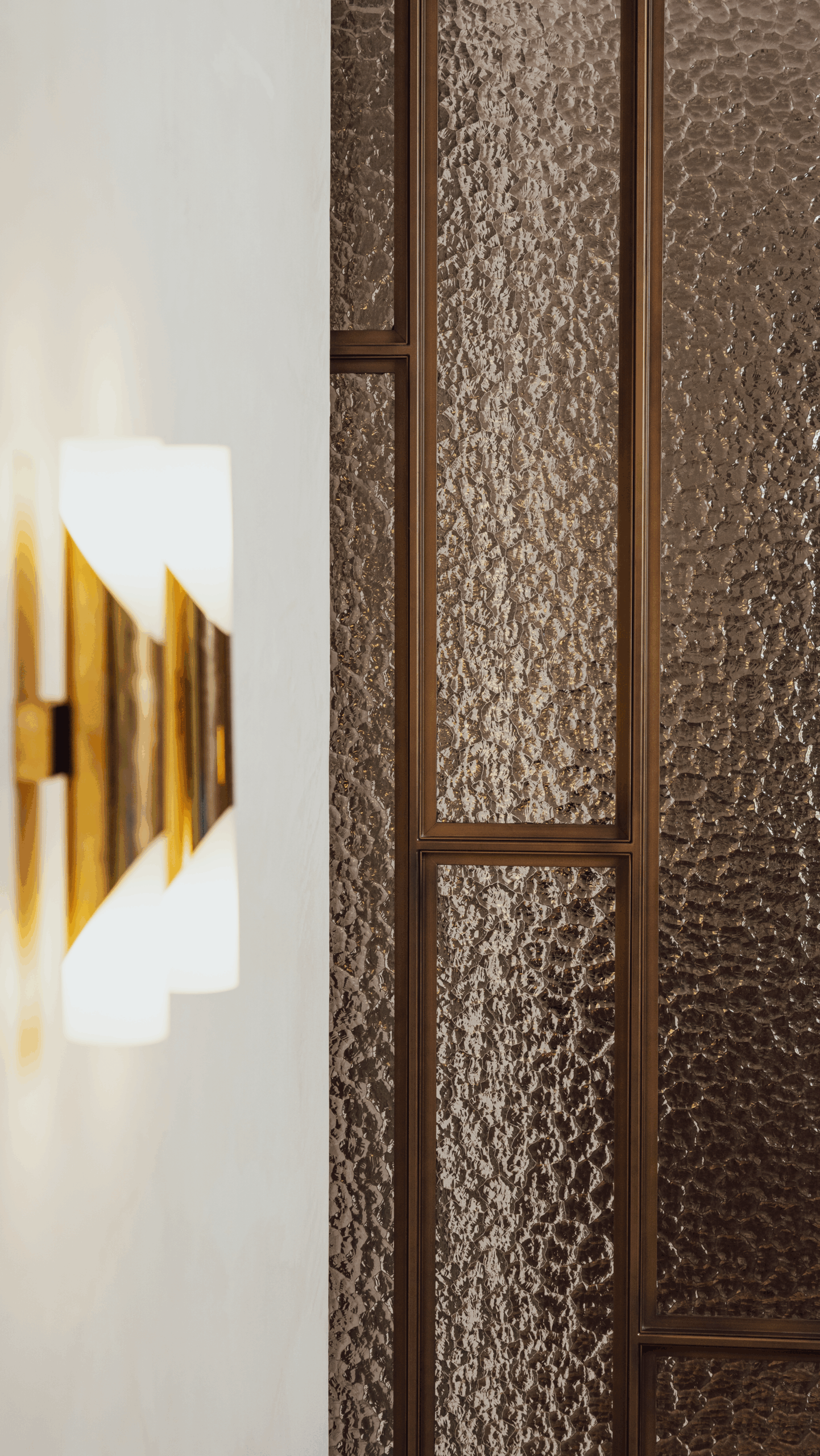Ze leverde zelf het ontwerp aan, met oog voor vorm, glas en afwerking. Er werd gekozen voor Byzantijns glas, een materiaal dat het jaren ’70 gevoel prachtig tot leven brengt. Voor de afwerking viel de keuze op een exclusieve, geborstelde bronskleur – een warme tint die het vintage karakter versterkt, maar ook elegantie en verfijning toevoegt.