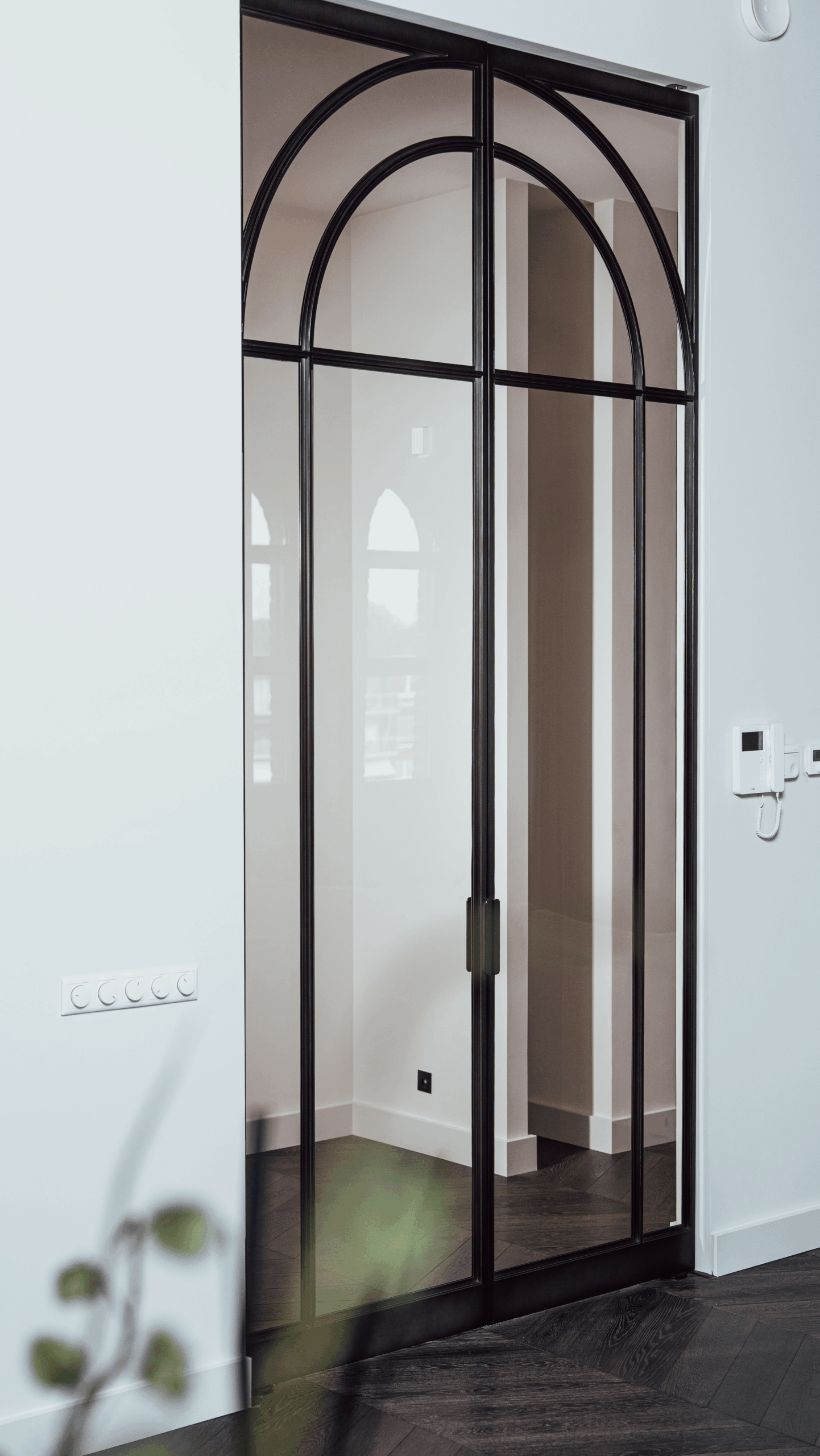 De wens van de klant was duidelijk: de rondingen van de originele buitenkozijnen moesten terugkomen in het ontwerp van de deuren. Zo ontstond een ontwerp met een dubbele boog, perfect in harmonie met de authentieke elementen van het pand – zoals de indrukwekkende plafonds met originele schilderingen. Historie en modern vakmanschap komen hier naadloos samen.